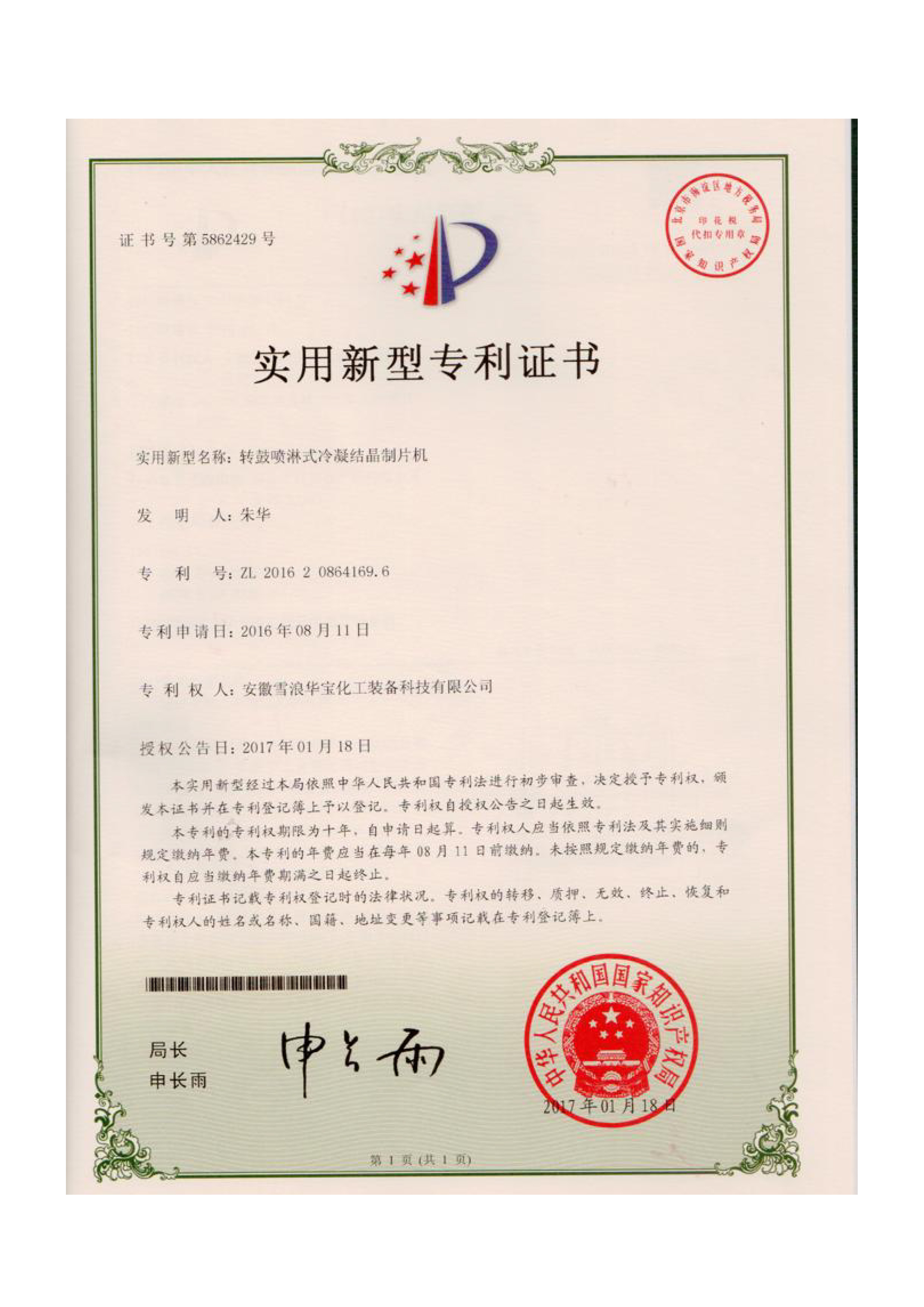 實(shí)用新型專利證書